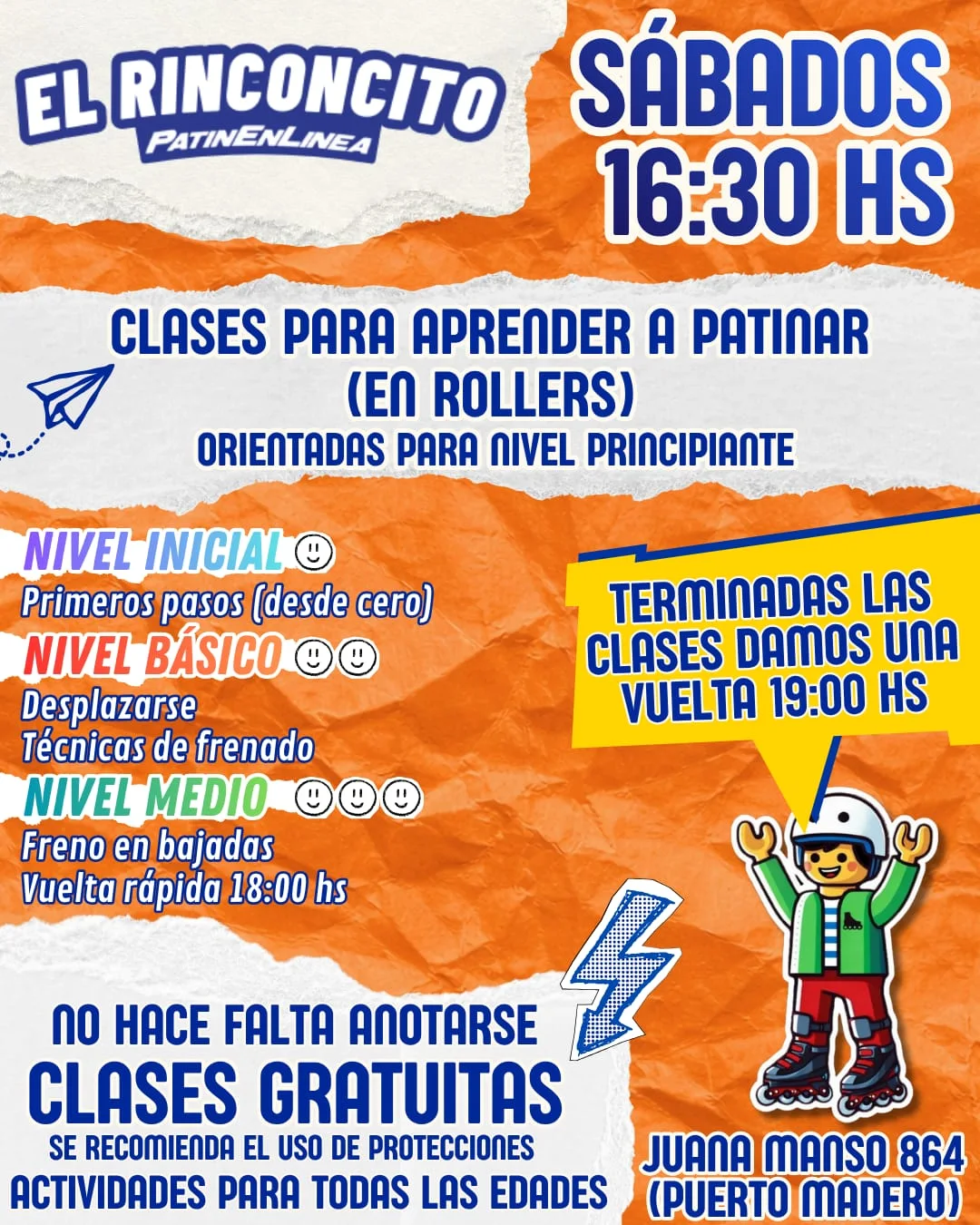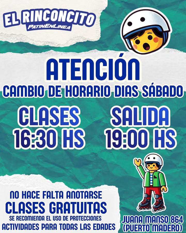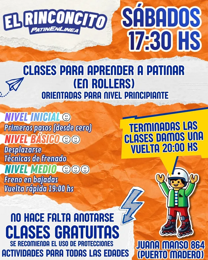 Classes to learn to skate (on rollers) aimed at beginner level. Initial level: First steps (from scratch). Basic level: Moving around. Braking techniques. After the classes we take a tour at 20:00 HS