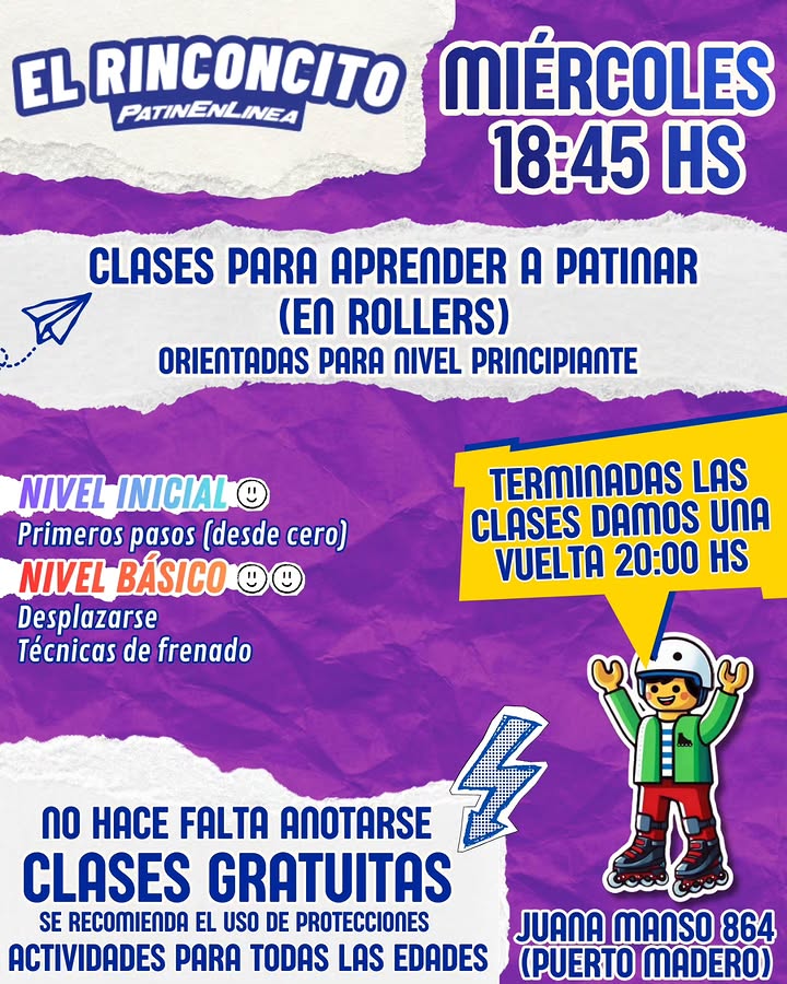 Classes to learn to skate (on rollers) aimed at beginner level. Initial level: First steps (from scratch). Basic level: Moving around. Braking techniques. After the classes we take a tour at 20:00 HS