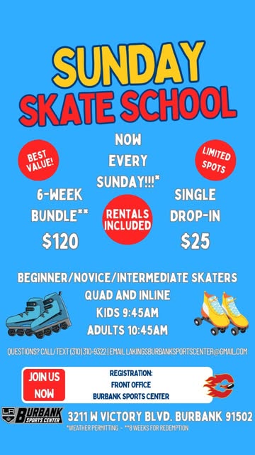 Beginner/Novice/Intermediate Skaters. Quad and Inline. Kids 9:45AM. Adults 10:45AM