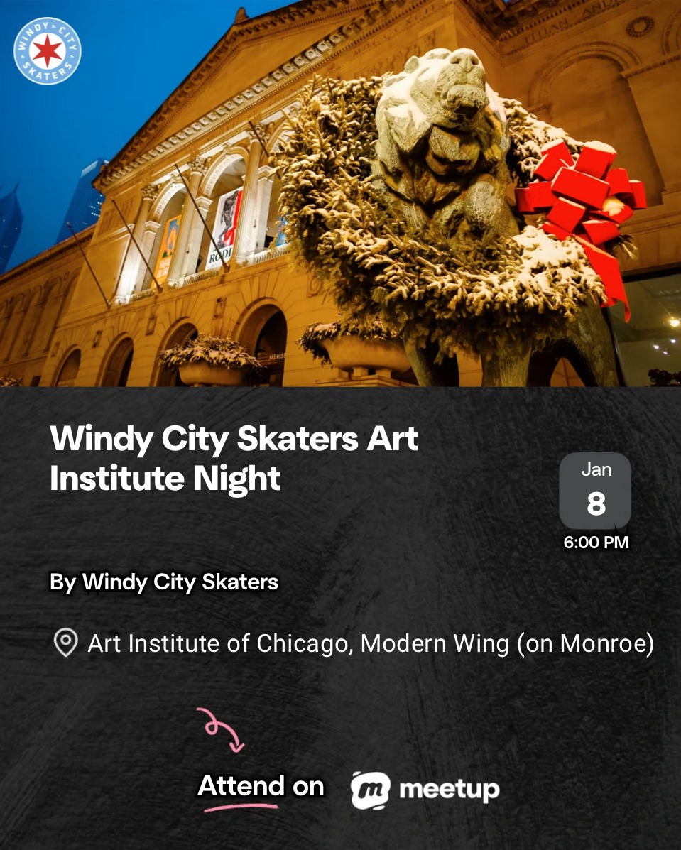 A no-skate, low-stress, off-season get-together, suggested by Abby. See if you can recognize other skaters without skates on. We'll meet at the Modern Wing Entrance on Monroe, then meander through the galleries.