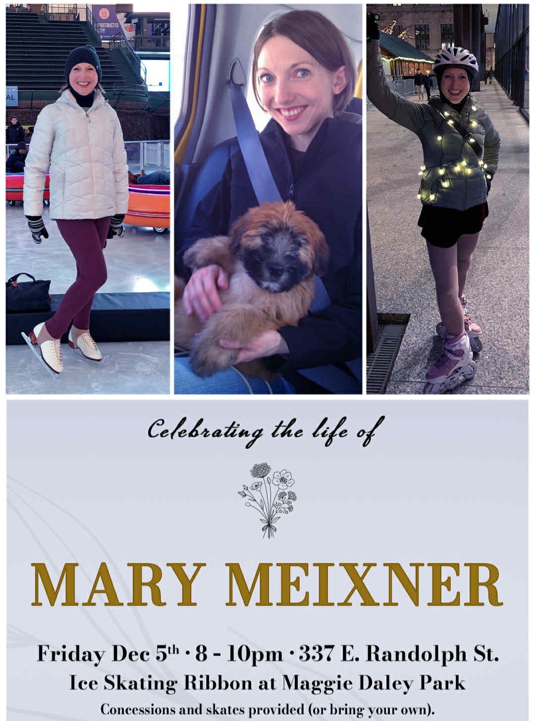 Celebrating the life of Mary Meixner by skating at the Maggie Daley Ice Ribbon. Free admission and free skate rental. Just check in with Ice Ribbon staff to get your wristband for admittance.