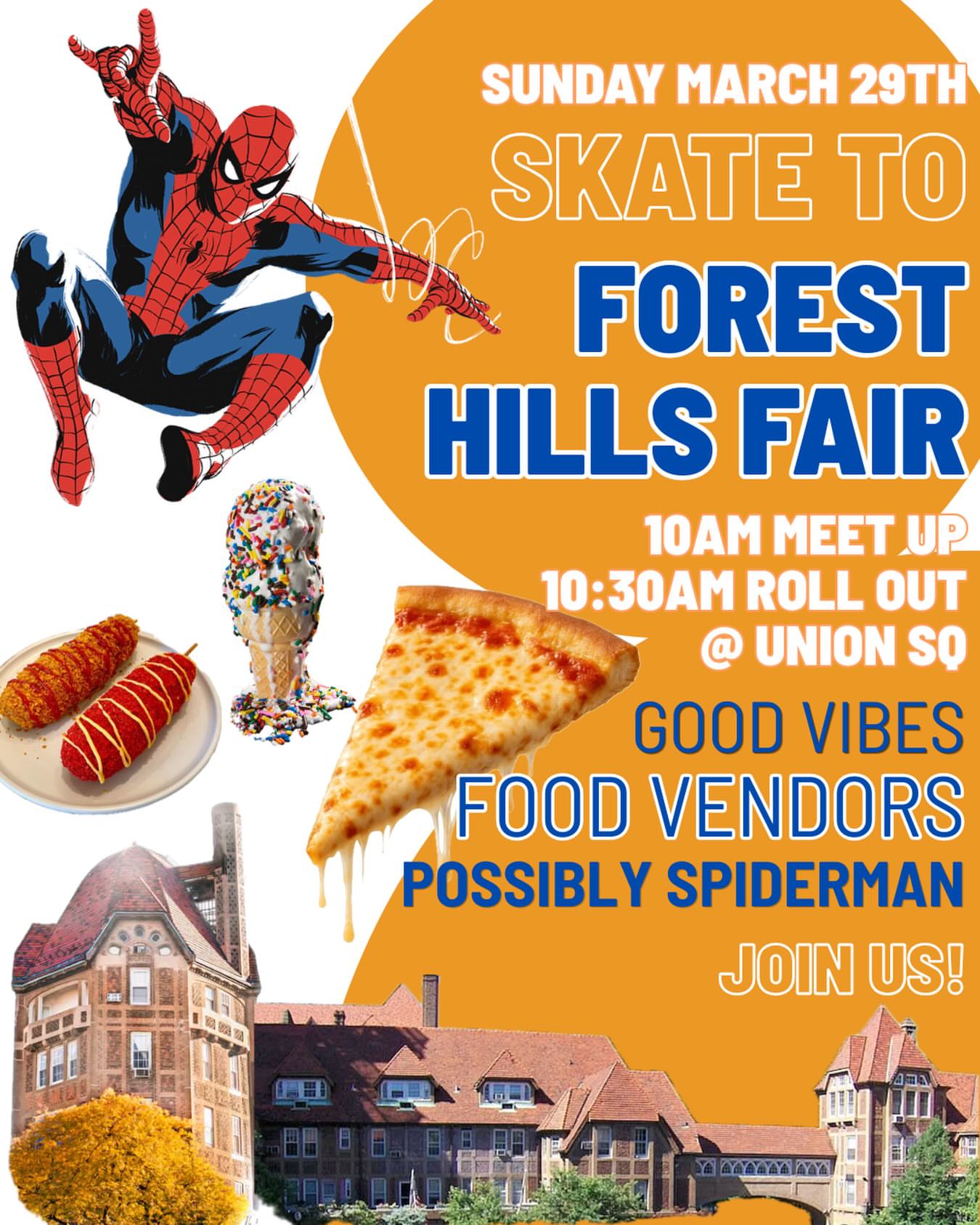 Skate to the annual Forest Hills Fair on Austin Street. Skating through some of Peter Parker's favorite hangout spots, ending at his home address in Forest Hills. Finish at the Forest Hills street fair for food, drinks, snacks.