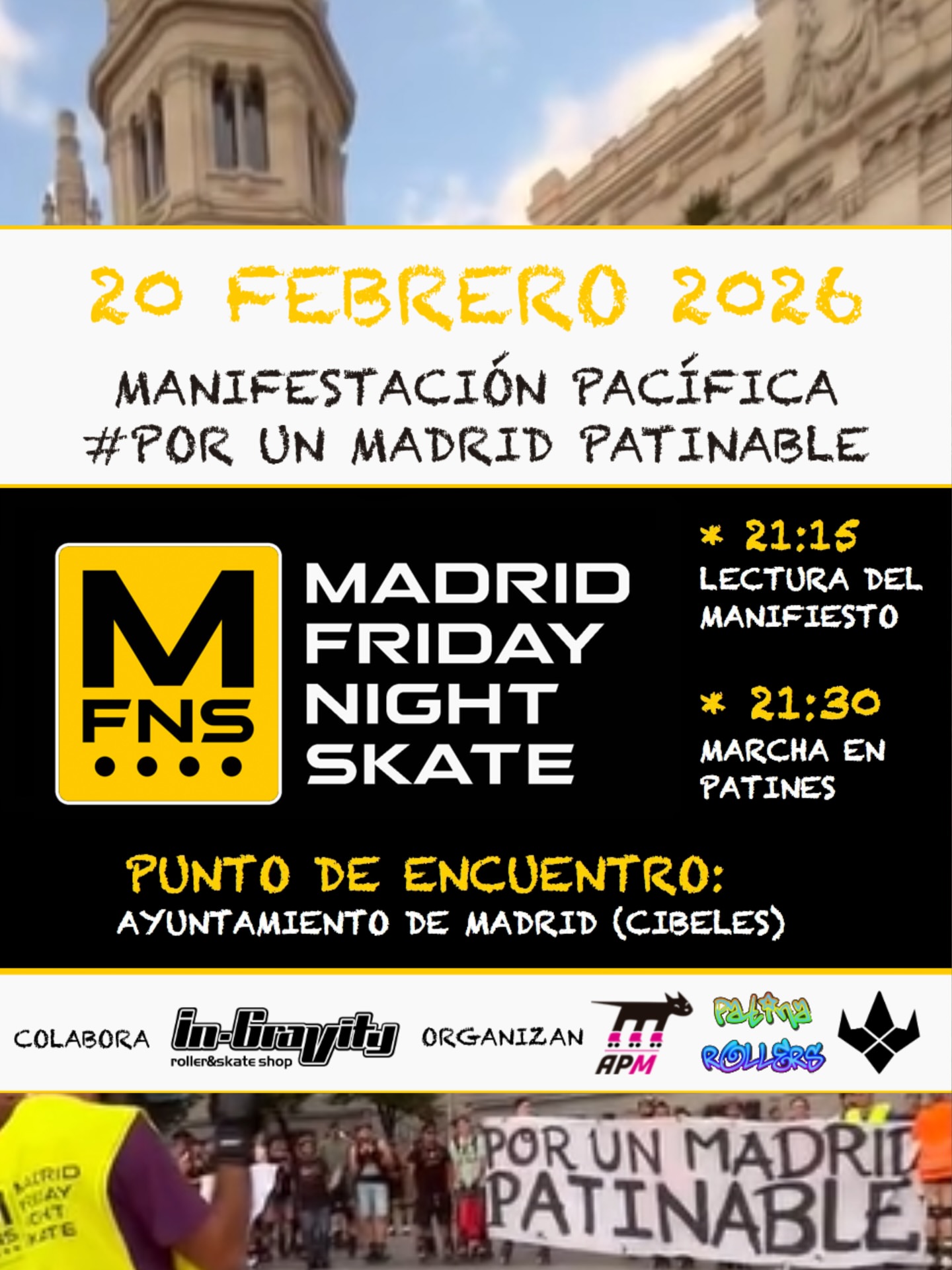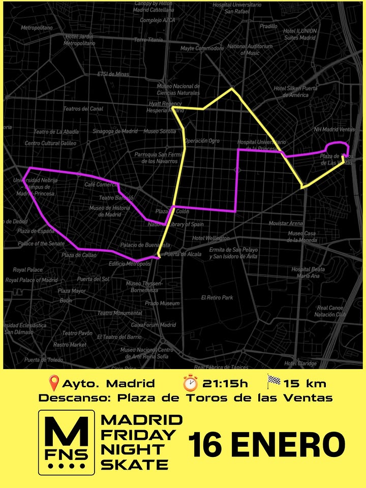 Madrid Friday Night Skate 20 de febrero 2026 21:15hs en Plaza de Cibeles. Recorrido IDA inicio por Pza. Cibeles, Pº. del Prado, Gta.Neptuno, P.del Prado, P.de Recoletos, Cl. Dª Bárbara de Braganza, Cl. de Fernando VI, Cl. de Mejía de Lequerica, Cl. Francisco de Rojas, Cl. de Luchana, Cl. de Santa Engracia, Pº. del General Martínez Campos, Pº. de la Castellana, Cl. de Génova, Cl. Sagasta, Cl. Fuencarral, Cl. de Jordán. Descanso en Plaza de Olavide. Recorrido VUELTA Cl. de Santa Feliciana, Cl. de Santa Engracia, Cl. Raimundo Fernández Villaverde, Cl. de Joaquin Costa, Cl. de Serrano, Cl. María de Molina, Pº. de la Castellana, Pº. de Recoletos, Pza. Cibeles Siempre debes seguir las instrucciones nuestros stoppers naranjas o amarillos. Es muy importante el uso de casco y protecciones, ya que eres tú el que vela por su propia seguridad. Se recomienda acudir puntualmente y disponer de hidratación durante el recorrido.