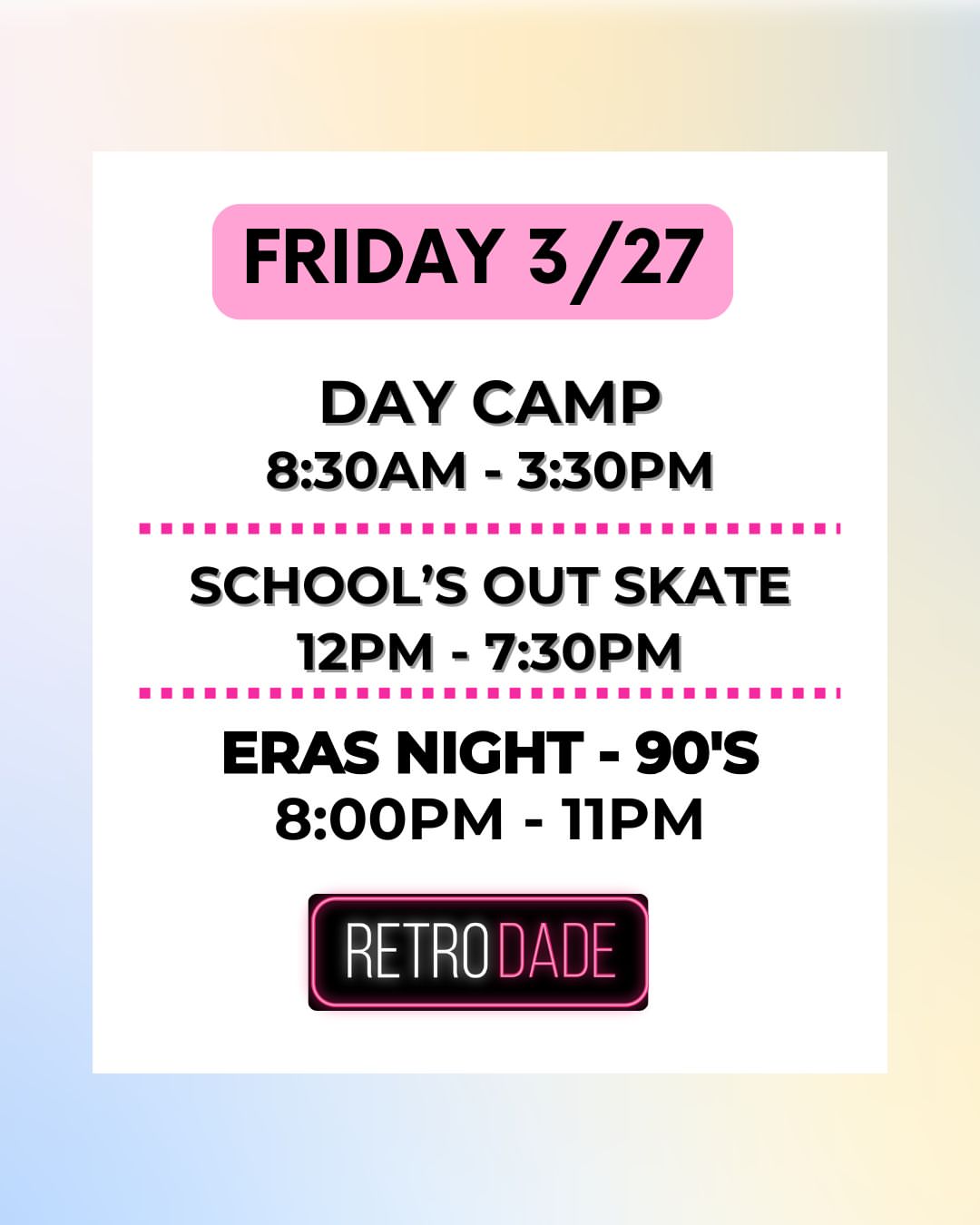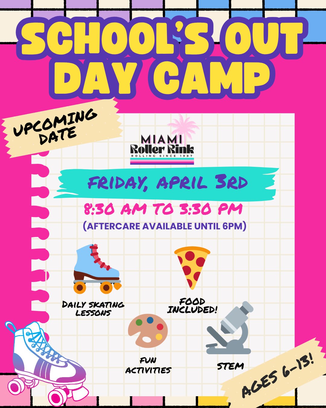 Daily skate lessons, skate rentals & skate mates, STEM activities, Games, crafts & themed fun, Breakfast & lunch included