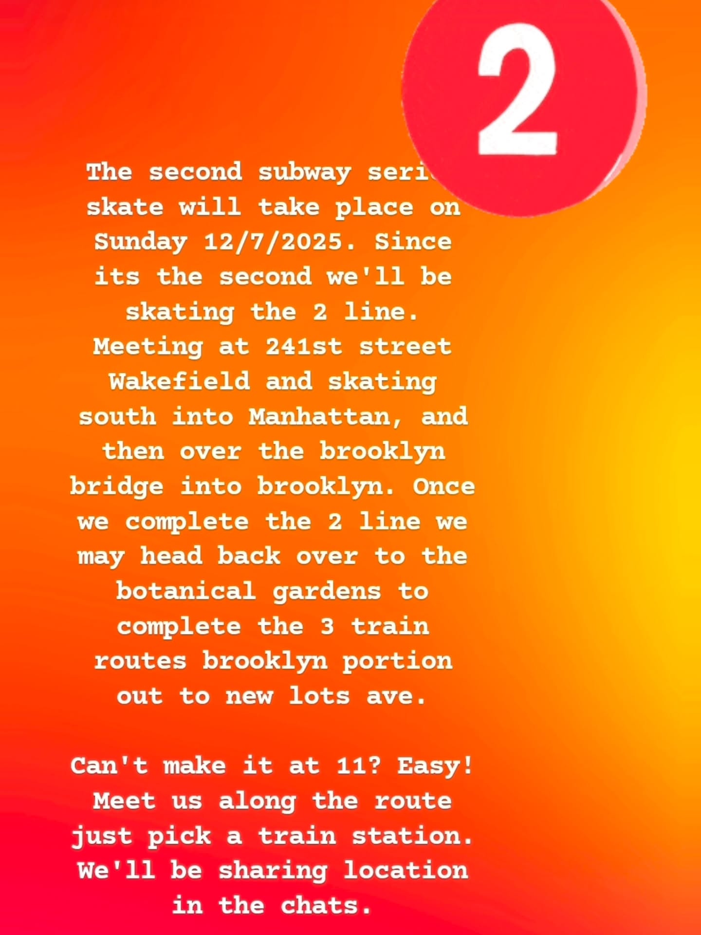 Skating south into Manhattan, and then over the brooklyn bridge into brooklyn. Once we complete the 2 line we may head back over to the botanical gardens to complete the 3 train routes brooklyn portion out to new lots ave.