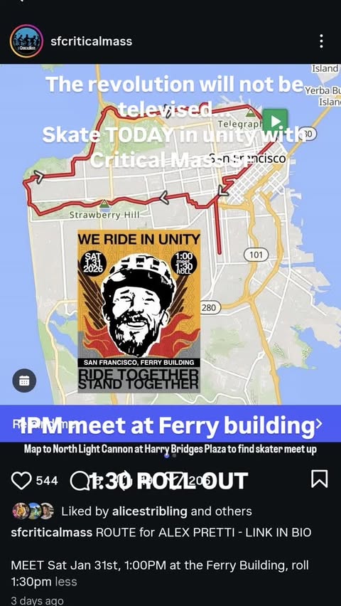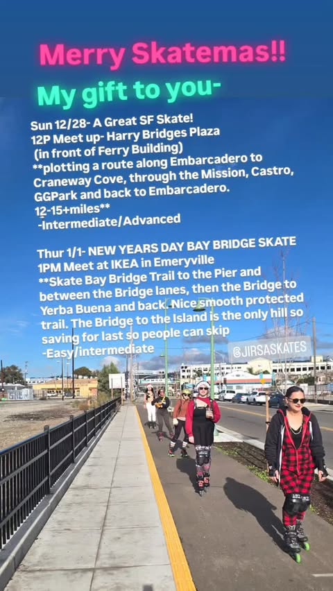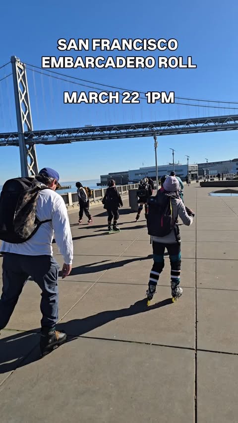Roll Out at 1PM from Ferry Building to Crane Cove Park Skating along the SF Bay Beginner Street Skate Friendly No hills + few street crossings! Just gorgeous views for days with brand new parks and art. Pitstops for dance parties. Return the way we came. BART, Ferry, Bus and Street Parking available.
