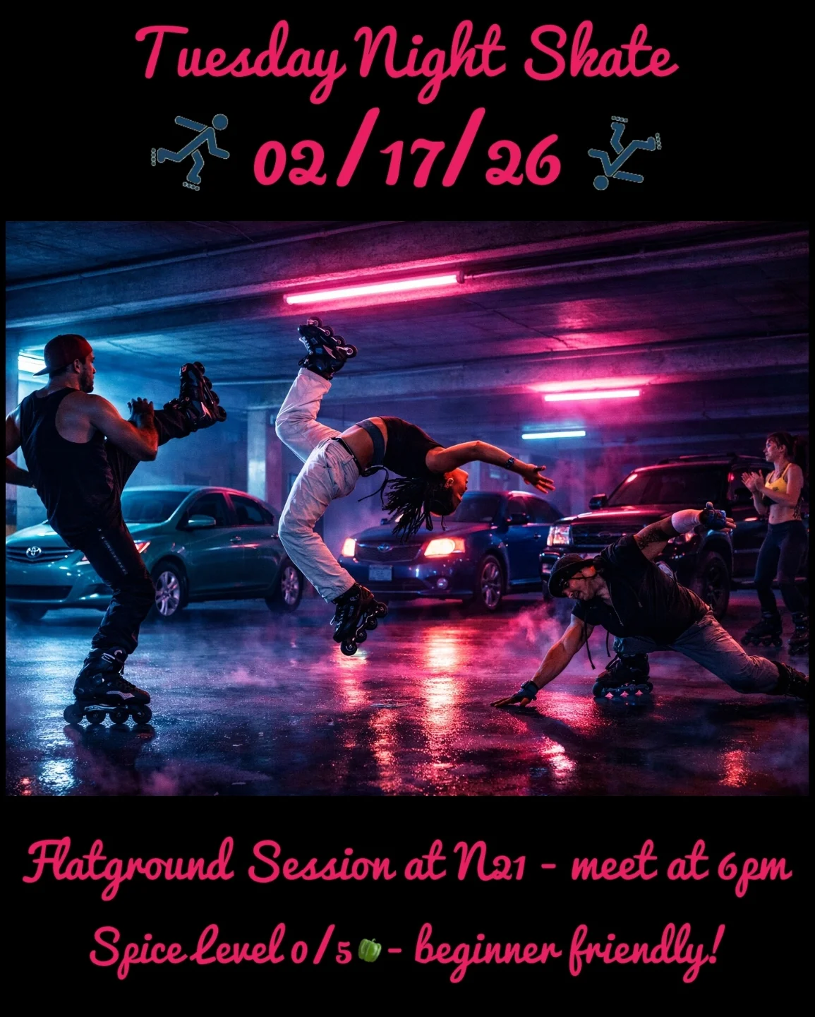 Flatground skating session under the cover of N21 parking garage. Beginner friendly!