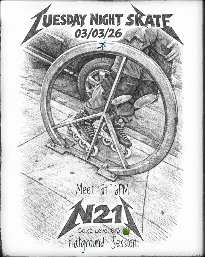 Flatground skating session. Beginner friendly with safety fundamentals, advanced braking and speed control techniques, artistic slides, wizard skating and some jumps.