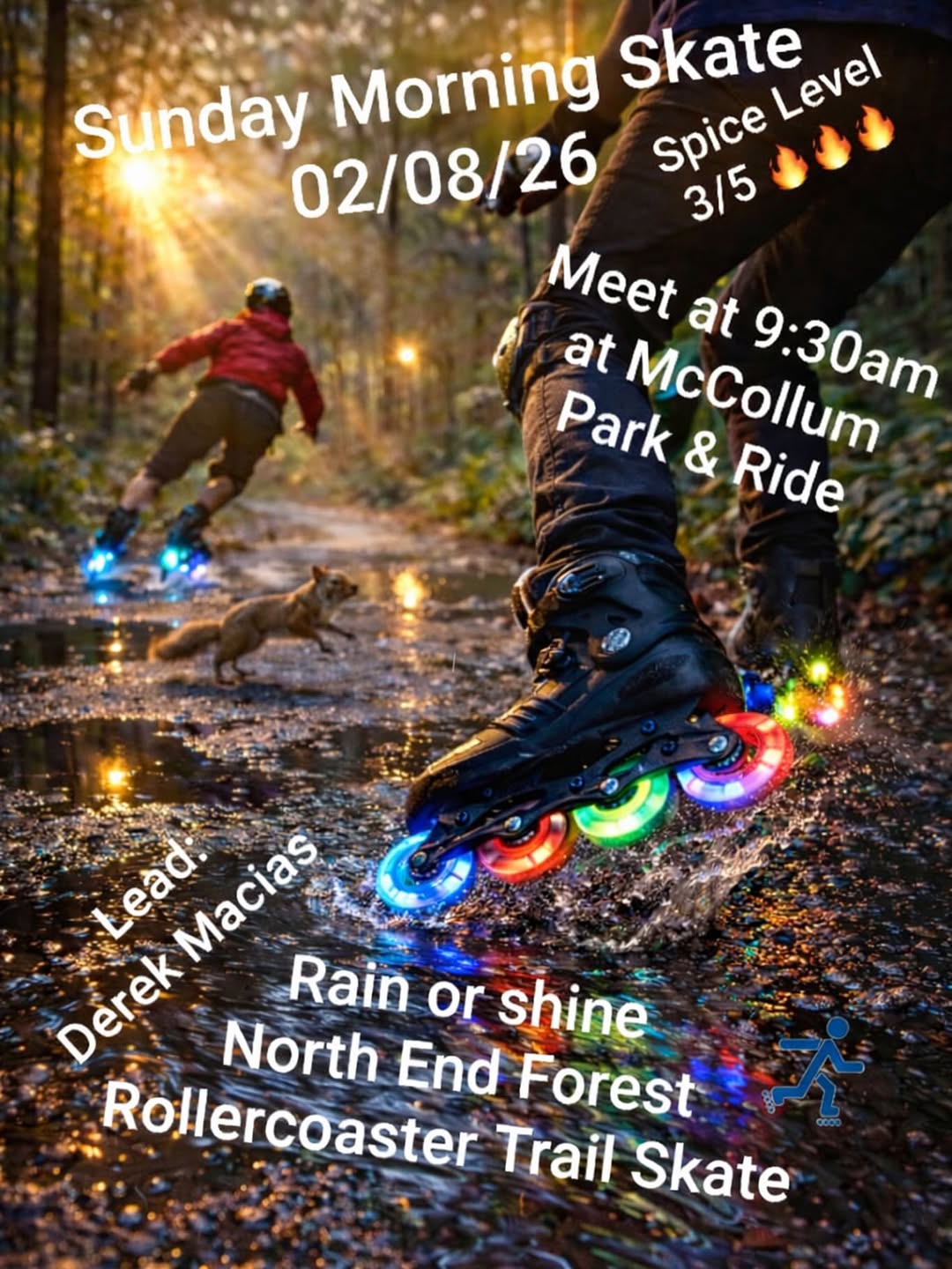Chill loops in the morning. Skate inner and outer loops, with a slide practice break at the boat ramp, and a resting stop at the Arch. All skill levels welcome!