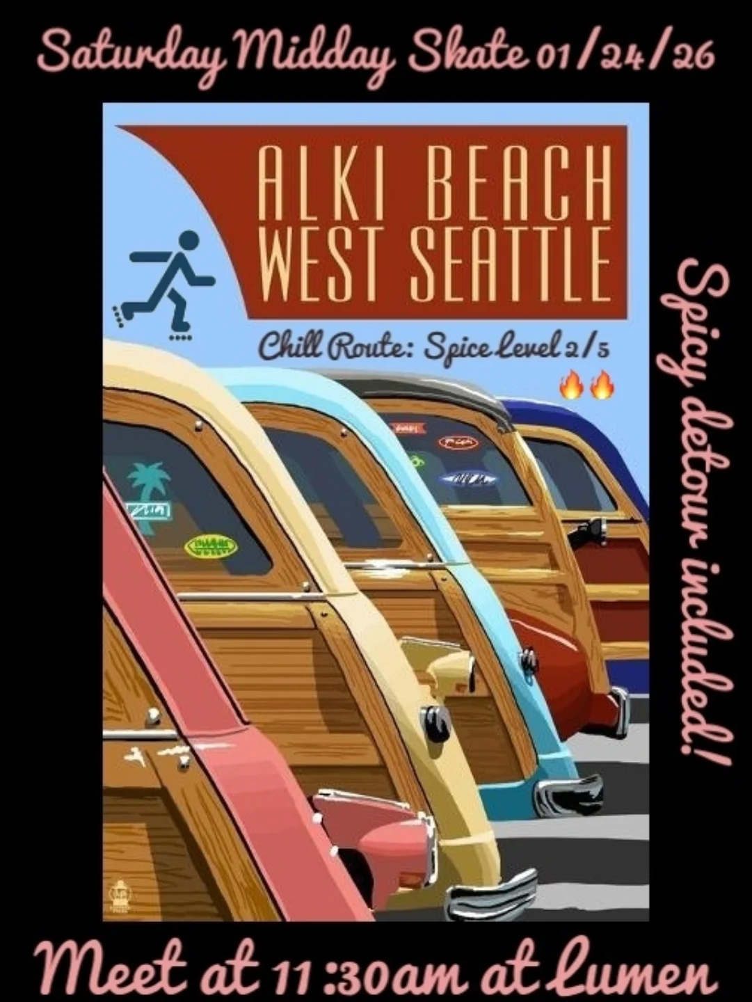 Skate from Lumen to Alki, eat and hang out for a while before skating back together at sunset around 4:30pm. Two groups: chill route along the water, or grand tour of the West Seattle hills. Both groups end up on Alki Beach.