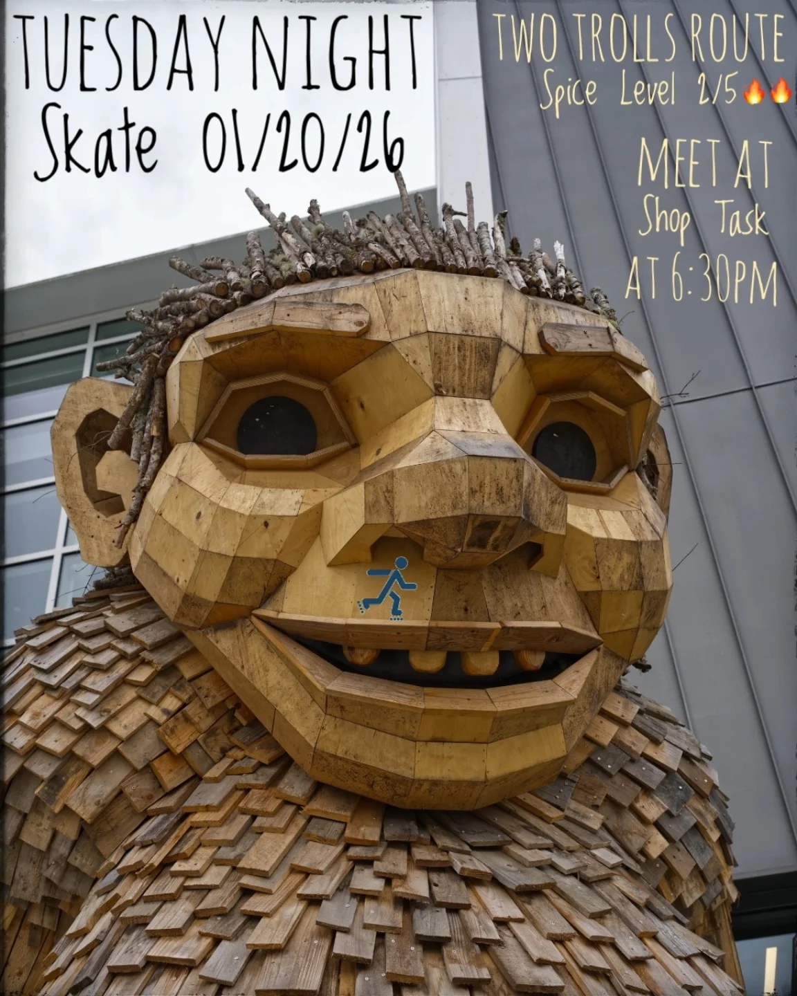 This chill T-roll leads us from SLU to Fremont bridge, where we put some effort to go up and say hi to Fremont Troll. After the stone guy, we are skating to Ballard to say another hi to Frankie, who is doing a bench press (if you can call it so) at the door of the Nordic History Museum. Empowered by our achievements, we proceed to Golden Gardens, which are Troll free at the moment, but still a great place to skate to before heading back to Shop Task.