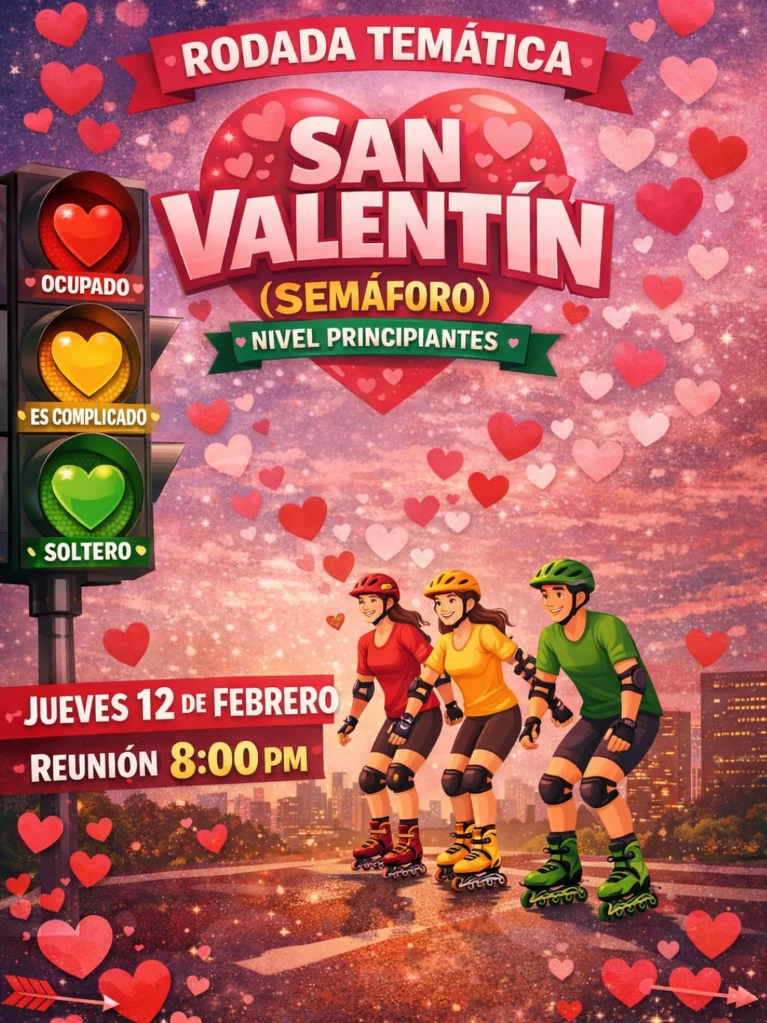 Rodada temática del 12 de febrero de 2026. Vístete con los colores del semáforo: Rojo: prohibido, Amarillo: Es complicado, Verde: Busco mi amor roller