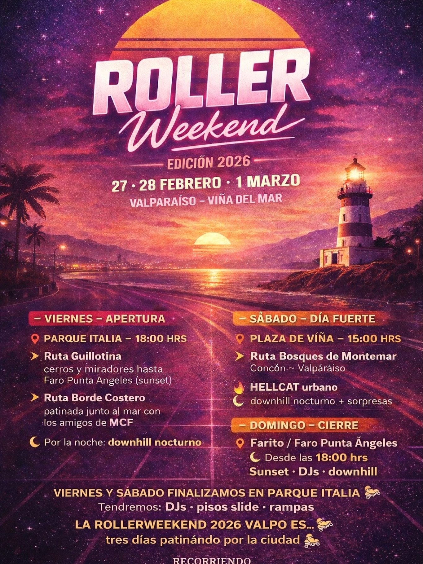 Los días 27 y 28 de febrero + 1 de marzo, la Quinta Región se transforma en el epicentro del patinaje. Valparaíso y Viña del Mar nos esperan para vivir tres días de rutas, comunidad, energía y libertad. Ven a despedir el verano junto a nosotros para patinar, reencontrarnos con los amigos de la vida , carretear y sobre todo disfrutar de buenos momentos !