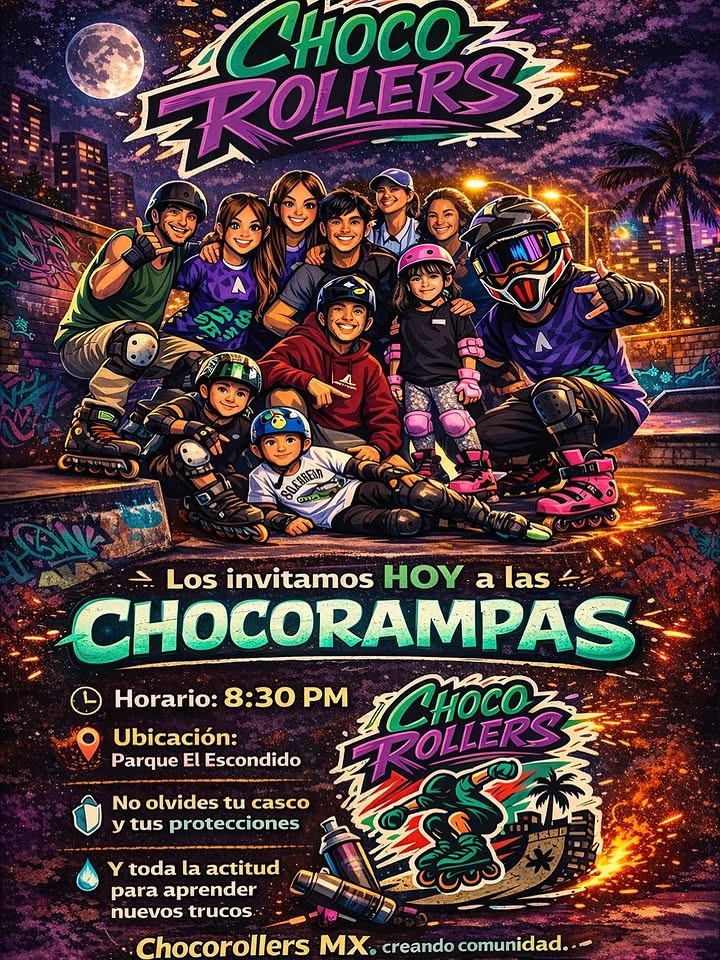 Comunidad de patinaje en Villahermosa, Tabasco. Rodadas de gala (Día del Patinador), Global Roller Day, prácticas semanales (skatecross, inline agresivo, fitness).
