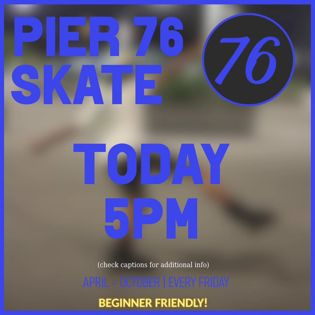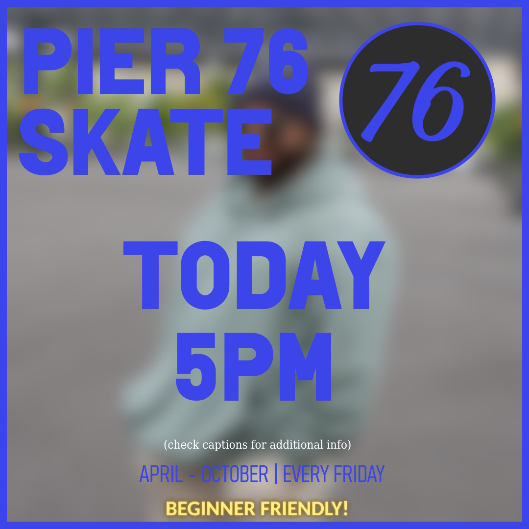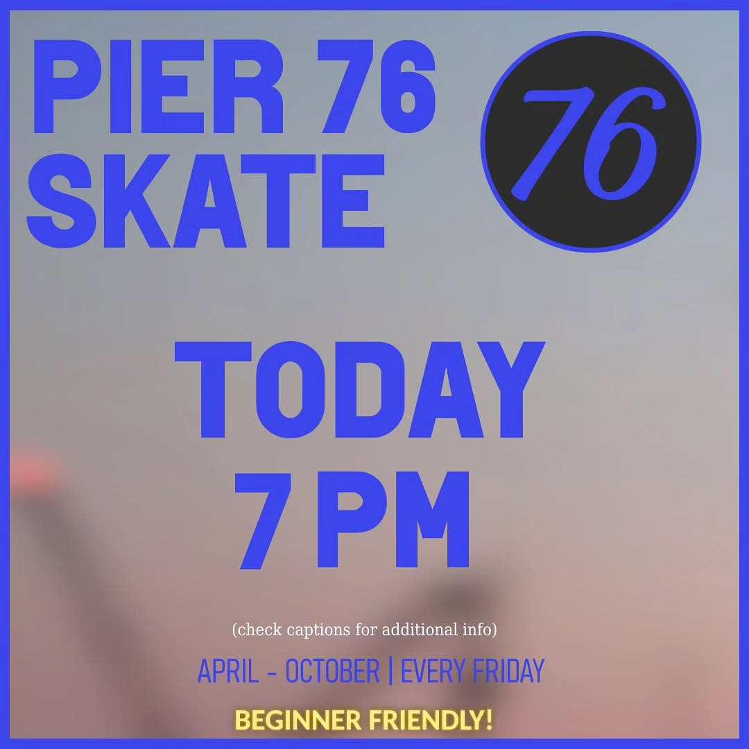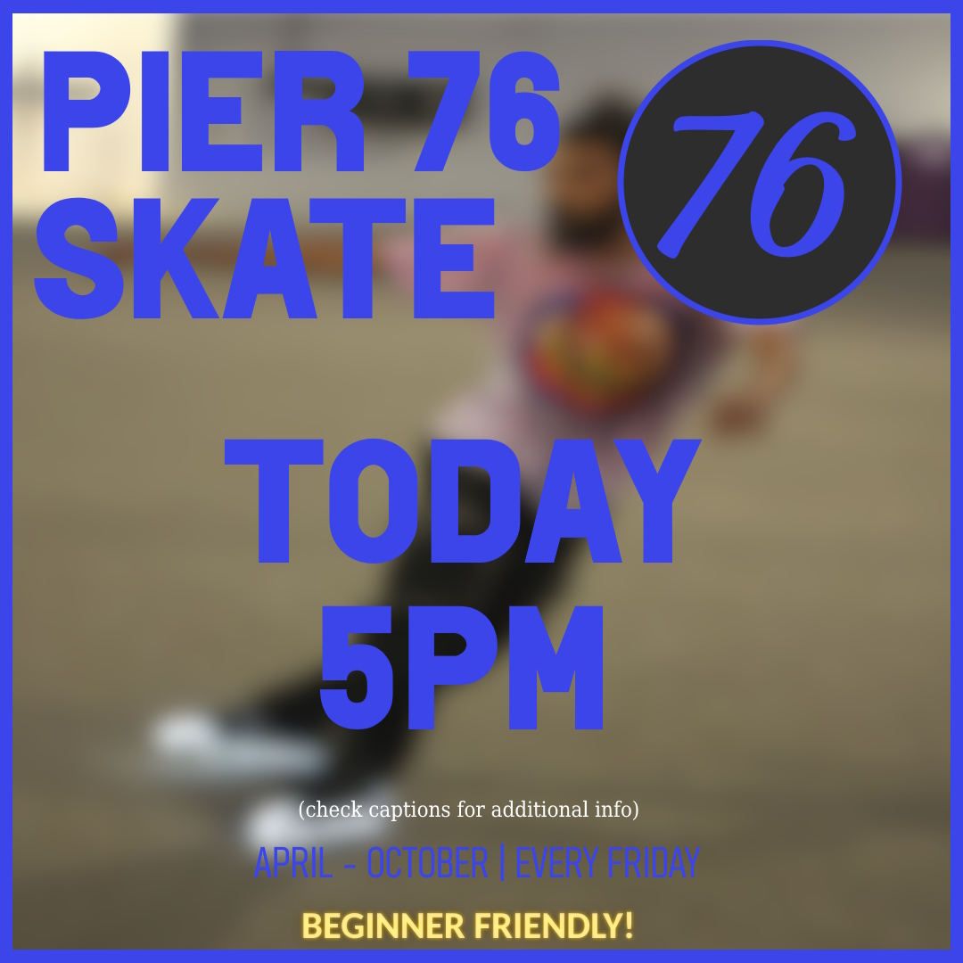 P76S — NYC adult skating community meeting at Hudson River Park's Pier 76 South. Recurring evening sessions (5PM start, weather-dependent), Friday rollouts during the season, theme nights (games/movies). End-season rollouts at Pier 17 South Street Seaport. WhatsApp community chat.