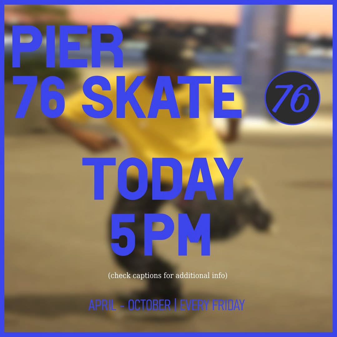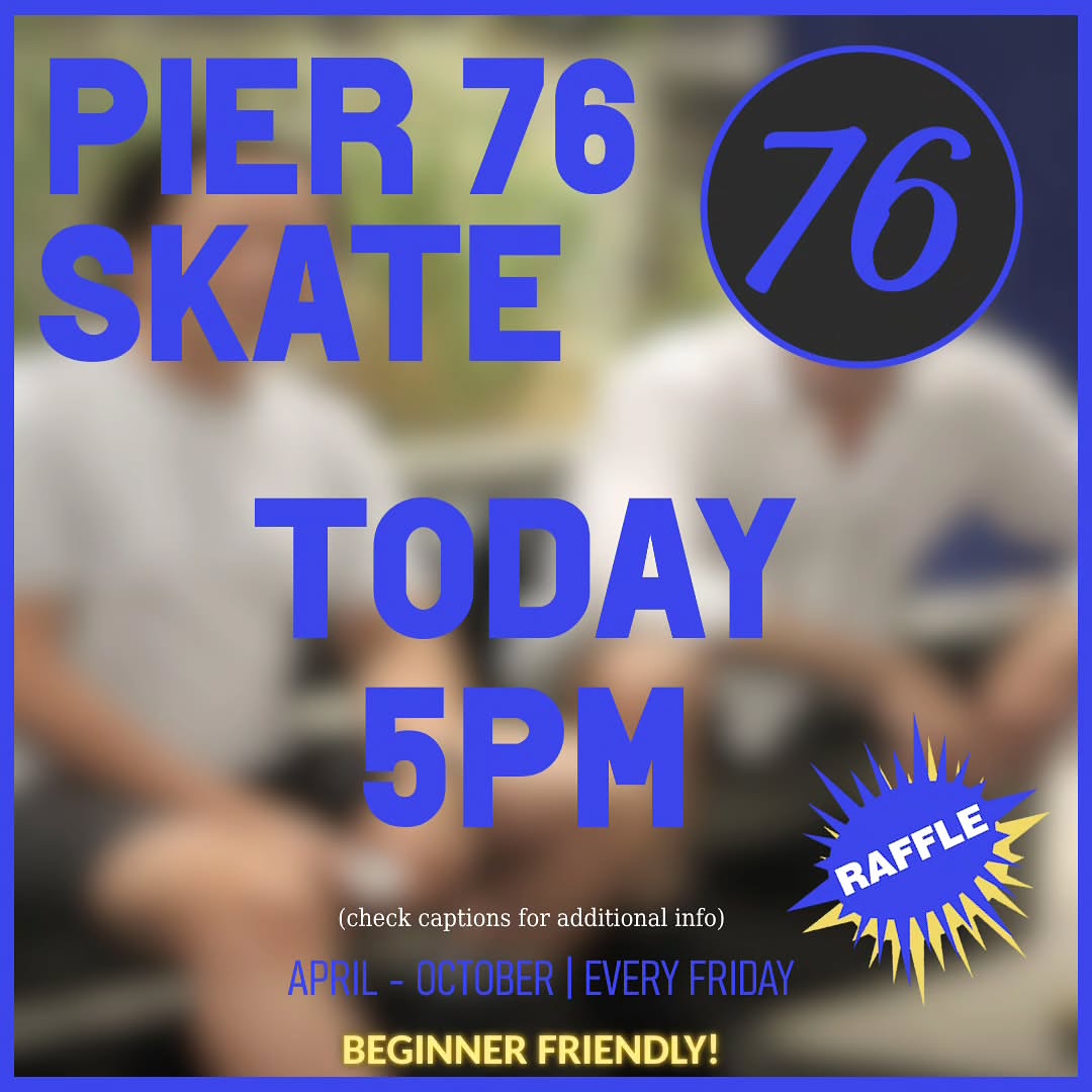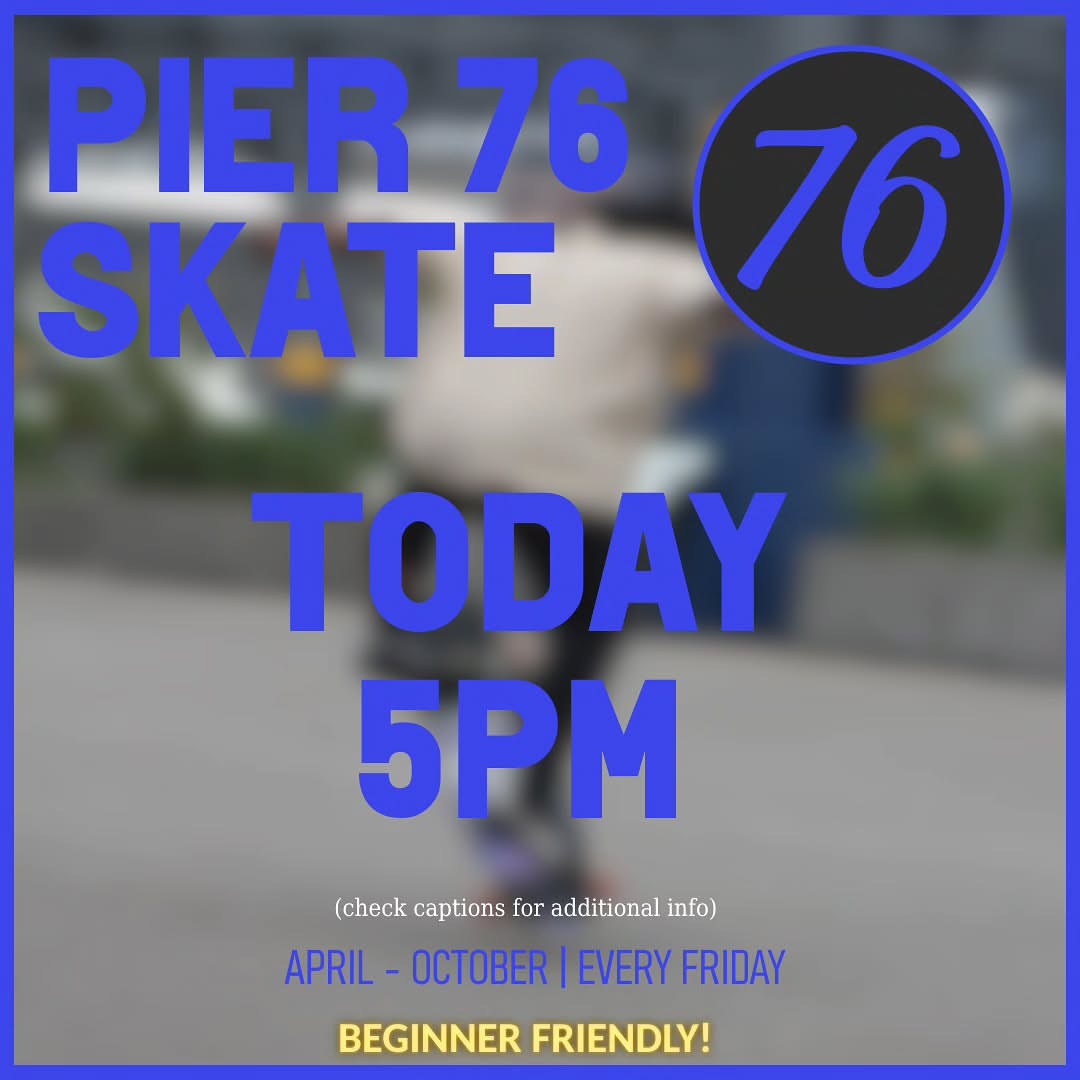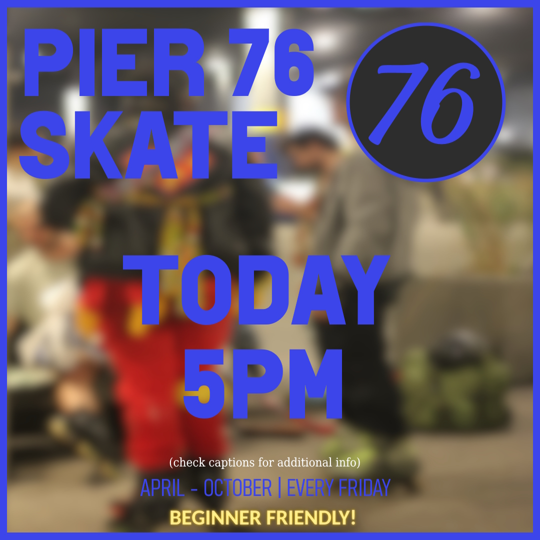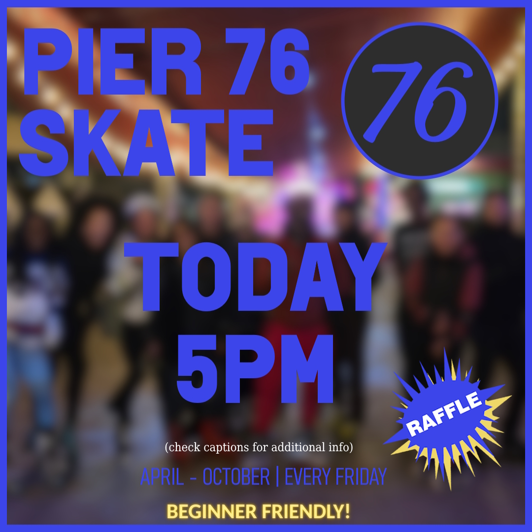 P76S — NYC adult skating community meeting at Hudson River Park's Pier 76 South. Recurring evening sessions (5PM start, weather-dependent), Friday rollouts during the season, theme nights (games/movies). End-season rollouts at Pier 17 South Street Seaport. WhatsApp community chat.