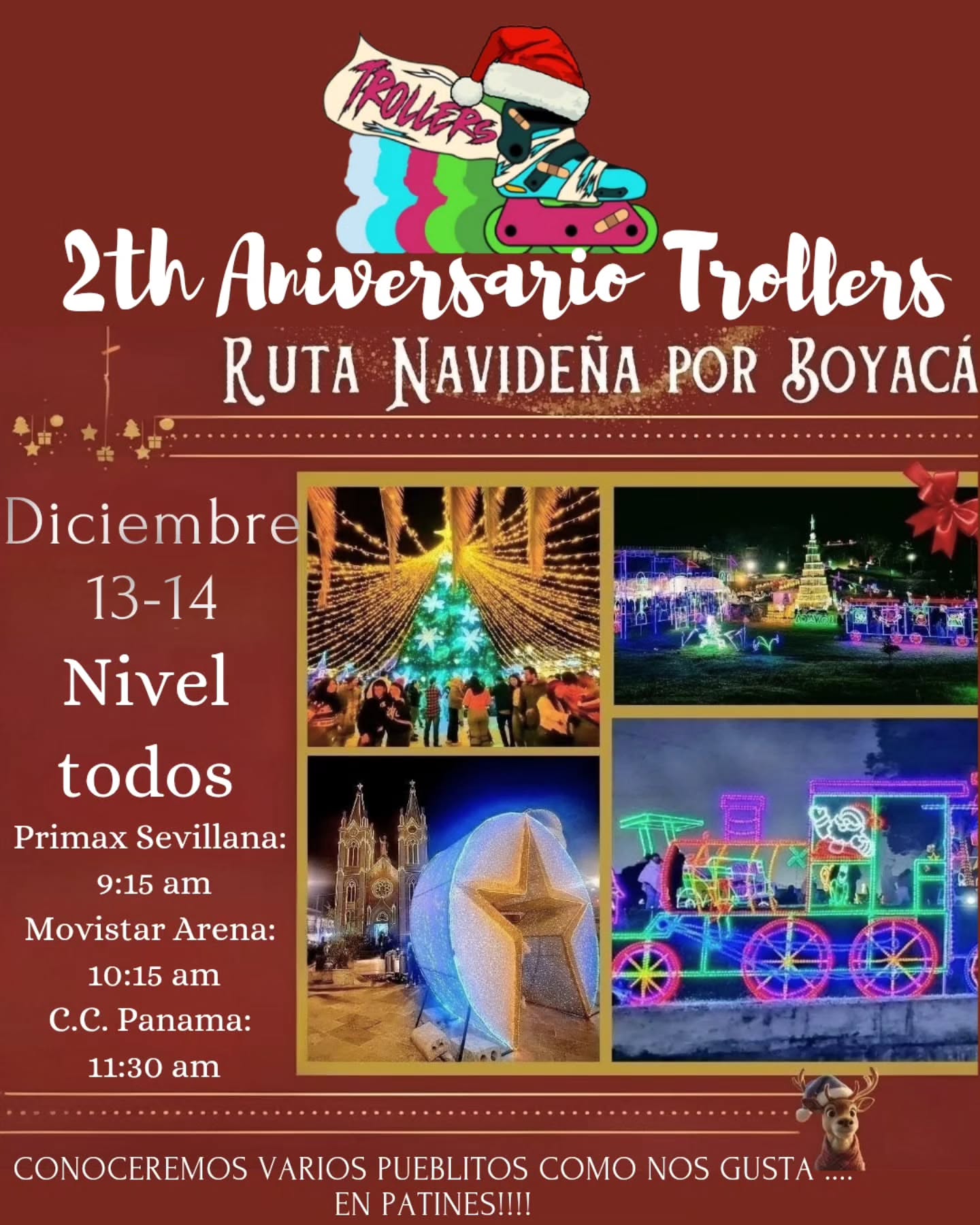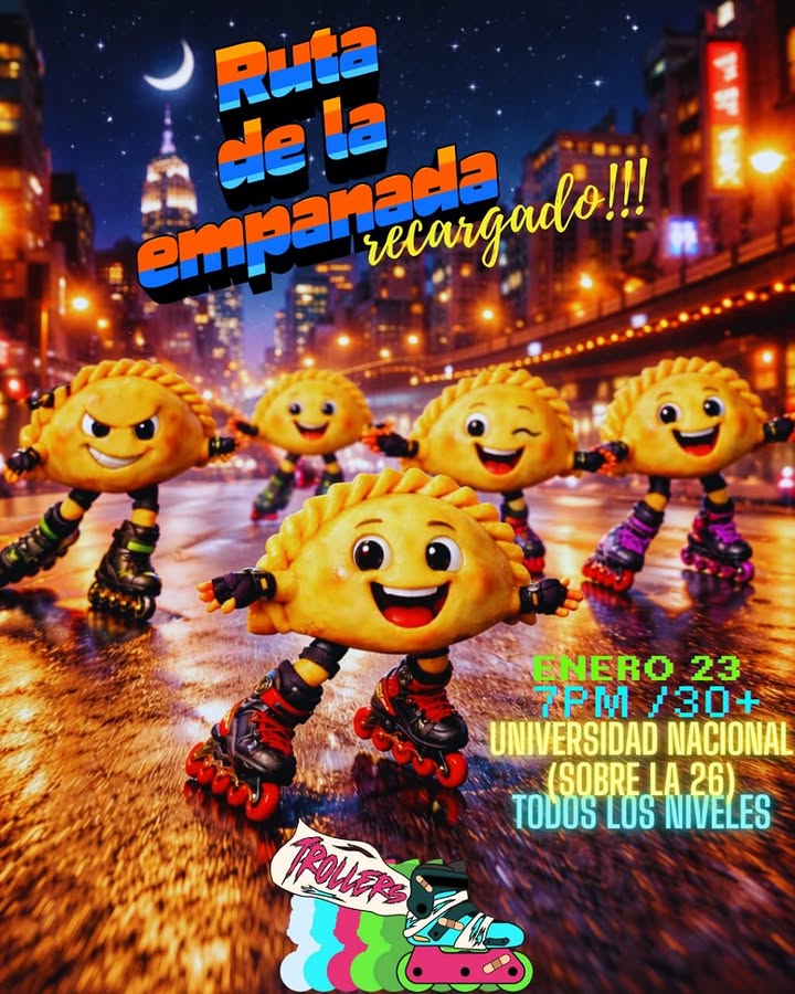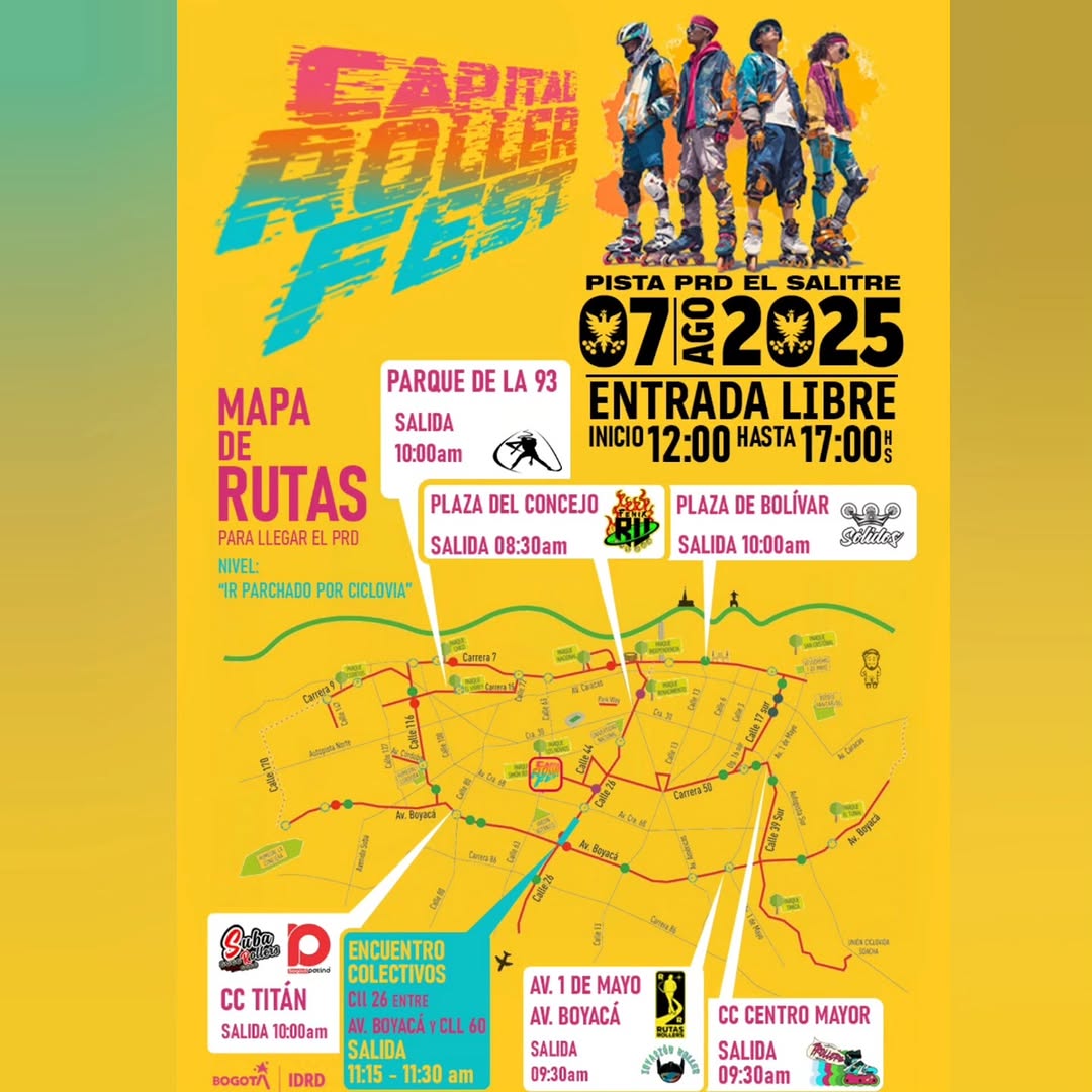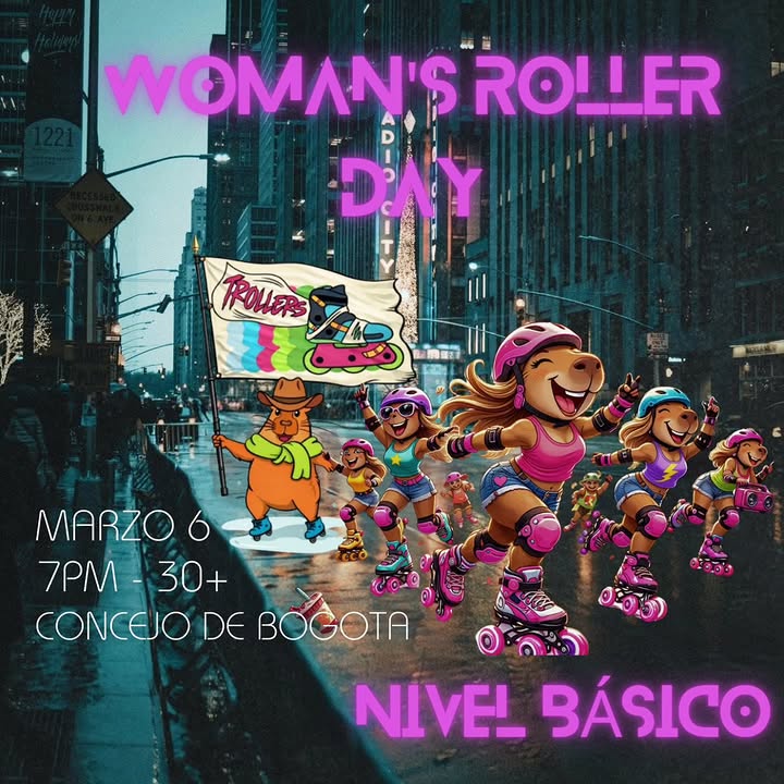 Comunidad roller en Bogotá. Rodadas mensuales temáticas (Año Nuevo, San Valentín, Woman's Roller Day, Día de la Niñez), todos los niveles. Rutas con punto de encuentro en Universidad Nacional, Concejo, Hacienda Sta. Bárbara, etc.